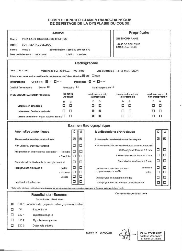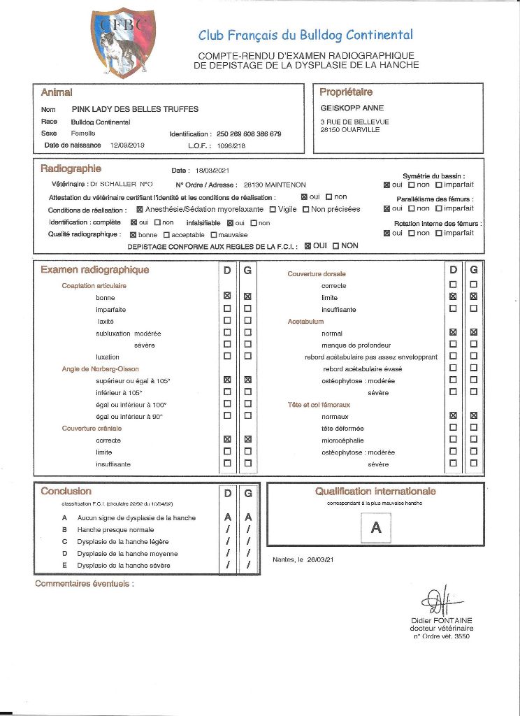 Hyperuricosurie (HUU) : N/N cystinurie : N/N dysplasie coudes : O/O dysplasie hanches : A/A |